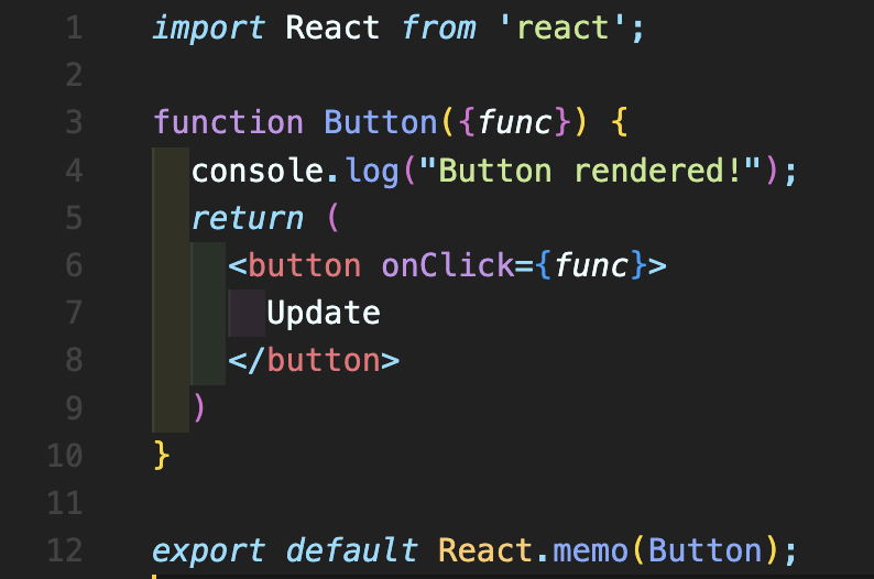 이번에는 Button.js로 따로 이 버튼 function를 분리해서 작성하겠습니다. 여기에서 React.memo(Button)으로 export 해줍니다.