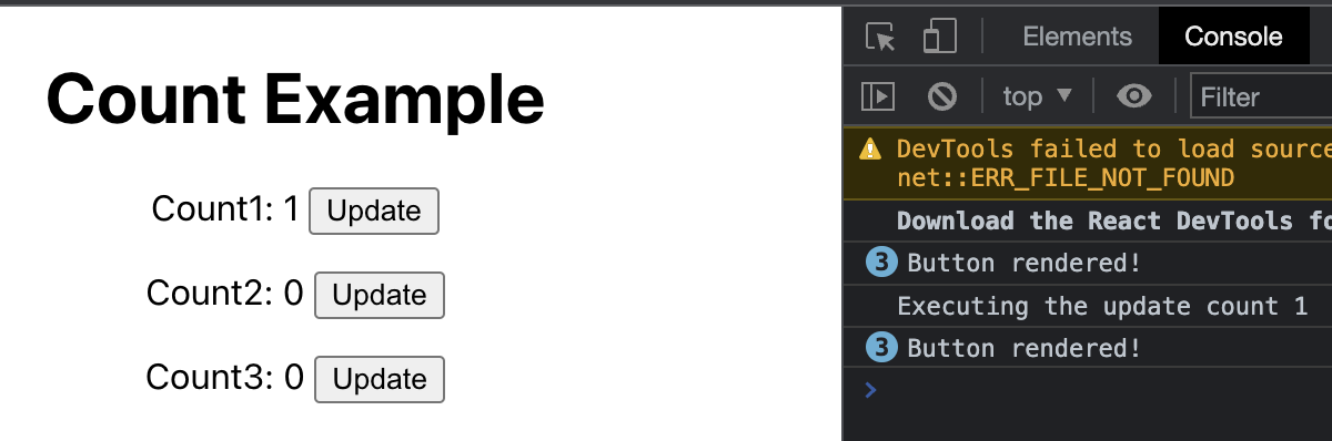 그 결과는 아래와 같습니다. 처음 3개의 버튼이 렌더링된 후, 변화된 카운트의 버튼만 렌더링이 다시 일어나게 됩니다.