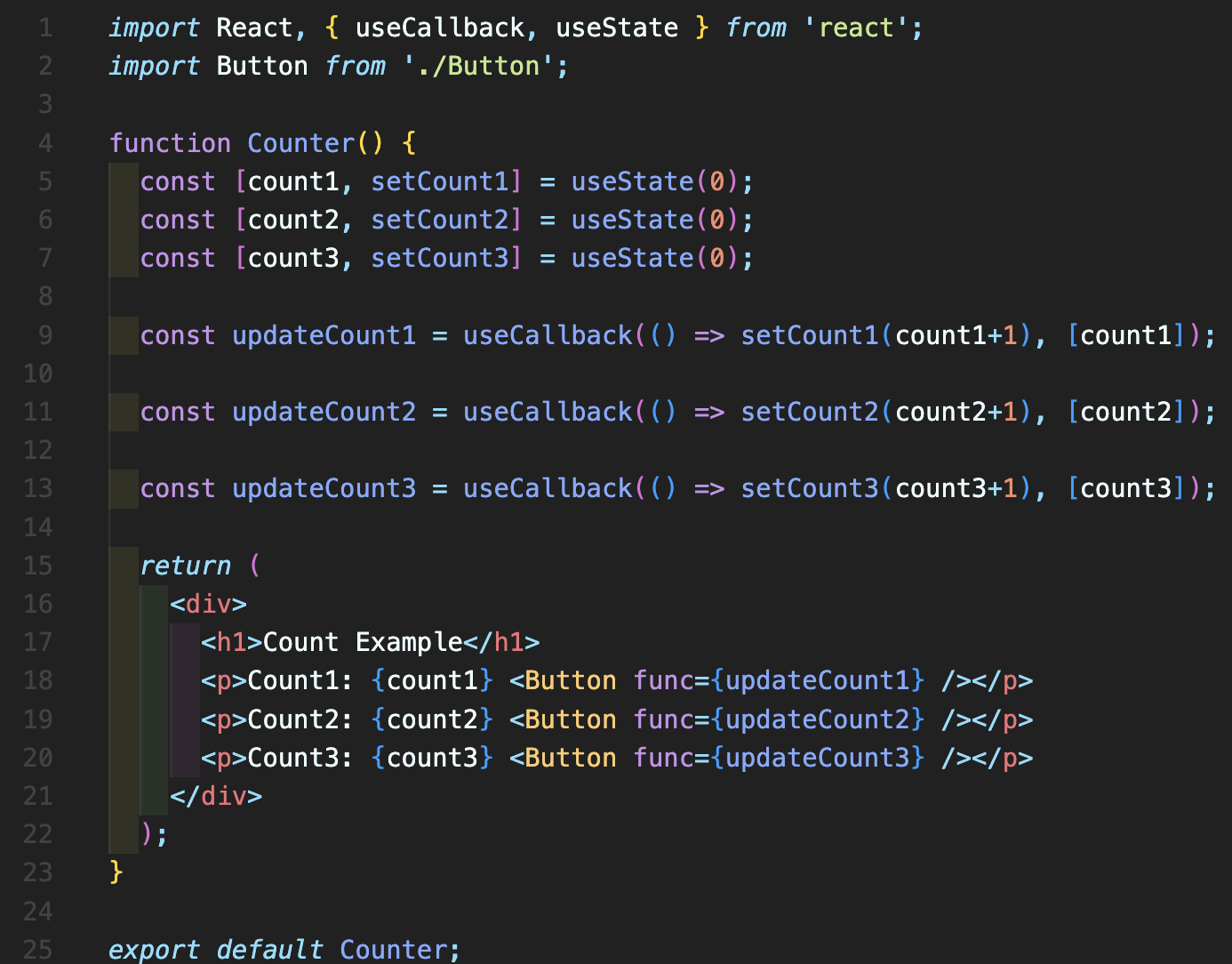 Counter.js 부분을 다음처럼 해주시면 됩니다. 9, 11, 13번째 줄에 보시면 useCallback 함수를 사용한 것을 보실 수 있는데 두 개의 인자를 받습니다. useCallback(함수명, [변경감지하는상태변수])를 넣으시면 됩니다.
