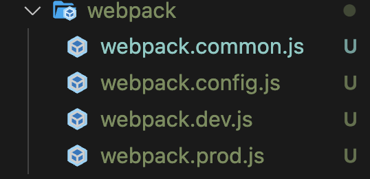 Step 1: 기존에 만들었던 webpack.config.js의 파일명을 webpack.common.js로 바꿔주고 새로 3개의 파일을 생성하여 각각 이름을 webpack.config.js, webpack.dev.js, webpack.prod.js로 명명해줍니다.