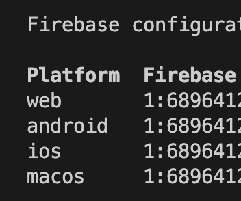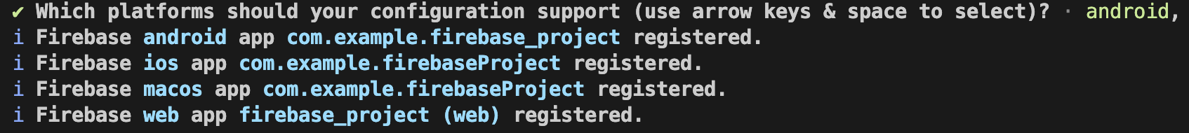 Step 3: flutterfire 커맨드 부분이 성공적으로 입력되어 실행되면 아래처럼 Which platforms should your configuration support라는 질문이 나오는데 저는 android로 선택했습니다.