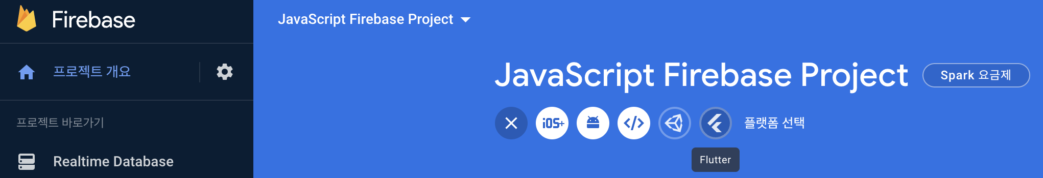 저는 기존에 JavaScript 용도로 파이어베이스 프로젝트를 생성한 적이 있어서 새로 프로젝트 만들지 않고 여기에서 앱 추가 버튼을 눌러주면 다음 스크린샷처럼 Flutter를 선택할 수 있습니다.