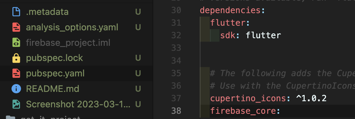 pubspec.yaml 파일에 들어가셔서 38번째처럼 firebase_core: 입력해주시고 Ctrl + S 또는 Command + S 하시거나 터미널에 flutter pub get 해주시면 됩니다.