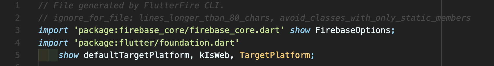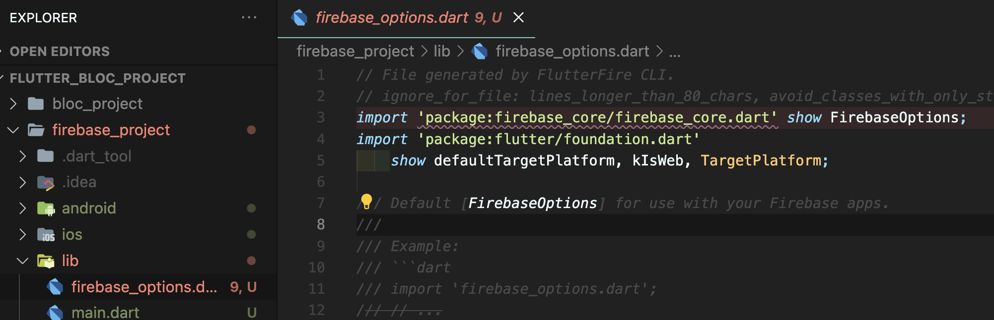아래 보시면 firebase_options.dart 파일이 생성되었을 것인데, 오류가 있다고 3번째 줄에 나옵니다. 그 이유는 아직 플러그인을 추가해주지 않았기 때문입니다.