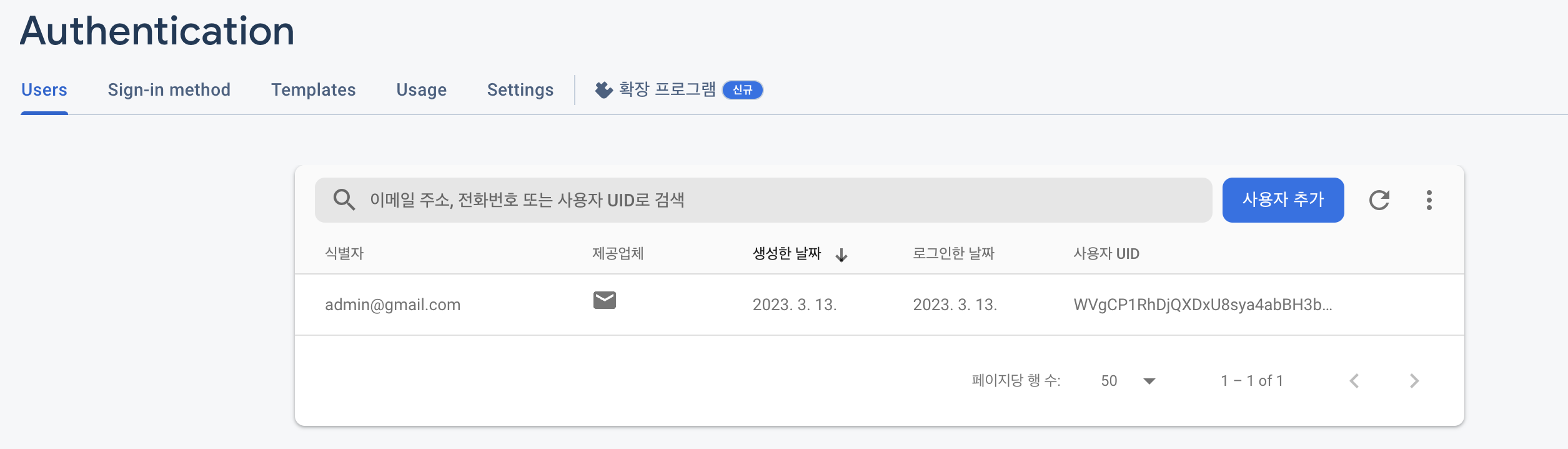 admin@gmail.com으로 회원가입 완료한 후 아래 화면인 파이어베이스 Authentication의 Users에 다음처럼 나오면 성공입니다.