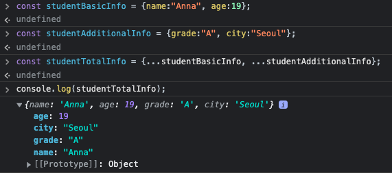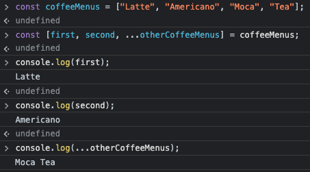 위 화면을 보시면 coffeeMenus에 4가지의 커피 요소들을 넣었고, 그 다음 줄에서는 [first, second, ...otherCoffeeMenus]를 만들어서 4개의 요소였던 coffeeMenus 배열을 해체하여(Deconstructing) 3개의 변수들로 분배하는 작업입니다. first에는 latte가 들어가고 second에는 americano, ...otherCoffeeMenus라는 변수에는 라떼와 아메리카노를 제외한 Moca와 Tea가 들어가게 됩니다. 다만 나머지 모든 부분을 지칭해주는 ...이 반드시 들어가야 합니다. 이 스프레드 연산자는 객체(object)에도 동일하게 사용됩니다.