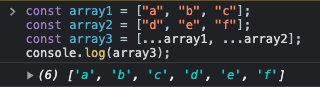 array1과 array2를 a,b,c와 d,e,f로 선언하였을 때 ...array1, ...array2를 사용하고 대괄호 []로 감싸줌으로써 array3은 배열로 감싸서 array1과 array2에 있는 모든 요소들을 취합하라는 의미입니다.