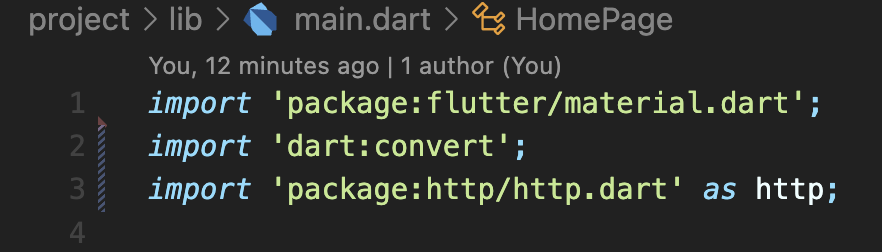 Step 2: main.dart에 다음처럼 import 해줍니다. (이 실습에서는 모든 코드를 main.dart에 작성하여 실습하며 이 모든 코드는 맨 아래에 첨부했습니다)