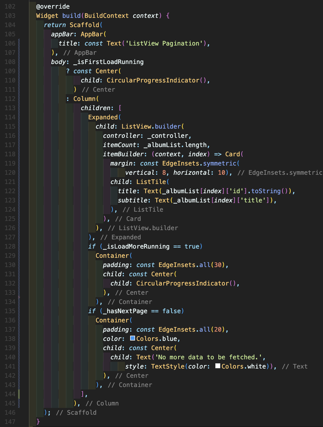 Step 7: Widget build 부분입니다. 여기에 108번째처럼 먼저 처음 로딩중인지를 확인하여 로딩 중이라면 로딩 중 위젯을 표시하고 로딩이 다 되었다면 ListView.builder로 해당 불러온 데이터 부분을 보여주면 됩니다. 그리고 추가적으로 로딩 중이라는 변수가 true라면 CircularProgressIndicator 사용해주면 되며 더 이상 불러올 데이터가 없는 경우, 텍스트를 사용해서 이를 알려주면 됩니다.
