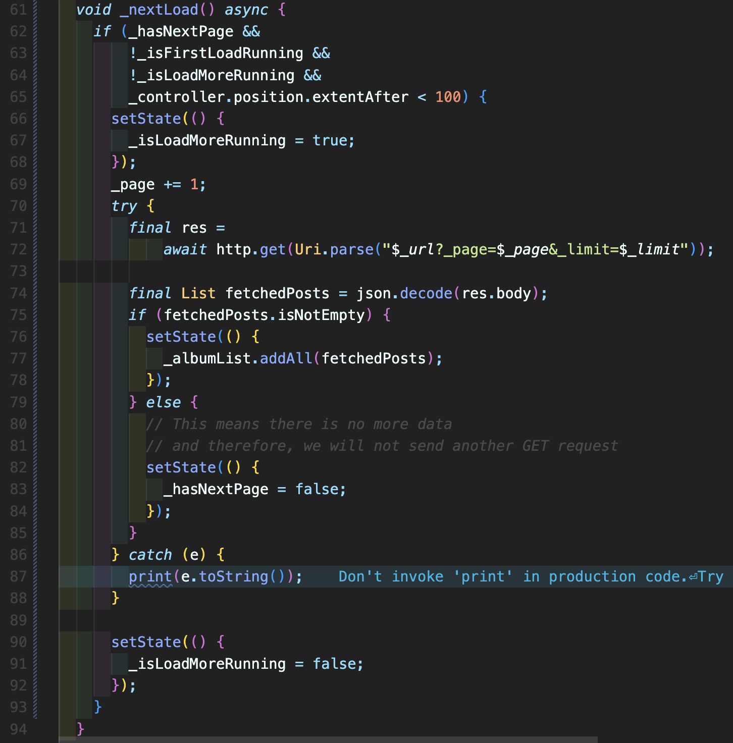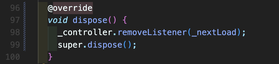 Step 5: _nextLoad() 메소드를 작성해줍니다. 여기에서 _controller.position.extendAfter < 100가 들어가는데 이거는 쉽게 이야기하여 현재 스크롤 할 수 있는 남은 픽셀 부분이 100 미만이라면 뜻이며 200이나 300으로 하셔도 됩니다. 이 extendAfter는 영어 설명으로 이렇게 되어 있습니다. The quantity of content conceptually "below" the viewport in the scrollable. This is the content below the content described by extentInside.