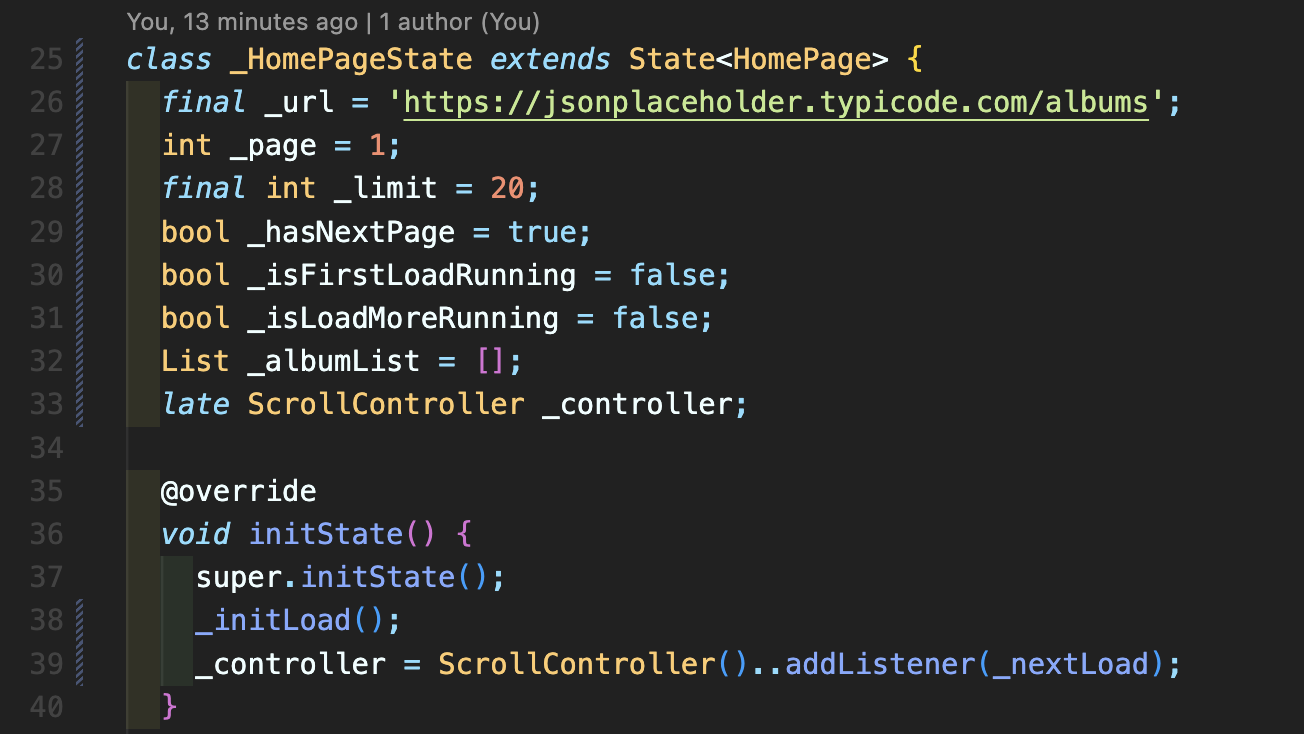 Step 3: 다음처럼 변수와 initState를 작성해줍니다. 여기서 _limit은 한 번에 가져올 데이터의 숫자이며, _hasNextPage는 다음 페이지가 있는지(추가 데이터가 있는지 여부), _isFirstLoadRunning은 처음으로 데이터 로딩, isLoadMoreRunning은 추가적인 데이터 로딩, _albumList에 데이터를 누적해서 추가해줄 변수입니다. 그리고 스크롤을 조절하는데 필요한 컨트롤러 변수까지 선언해줍니다. 그리고 initState에는 _initLoad()와 컨트롤러에 ..addListener로 리스너를 달아줍니다. 아직은 에러가 나오지만 밑에서 바로 추가할 것이기 때문에 입력해주면 되겠습니다.
