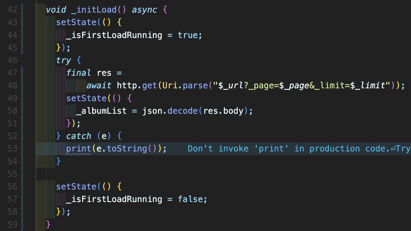 Step 4: _initLoad 메소드를 작성해줍니다. 여기에서 주목할 포인트는 먼저 _isFirstLoadRunning을 true로 바꾸어 현재 로딩중이라는 상태로 변경하고 그 다음에 데이터를 가지고 와서 _albumList에 반영해줍니다. 그리고 다 되었다면 _isFirstLoadRunning을 false로 변경하여 로딩이 모두 마무리되었음을 표시합니다.