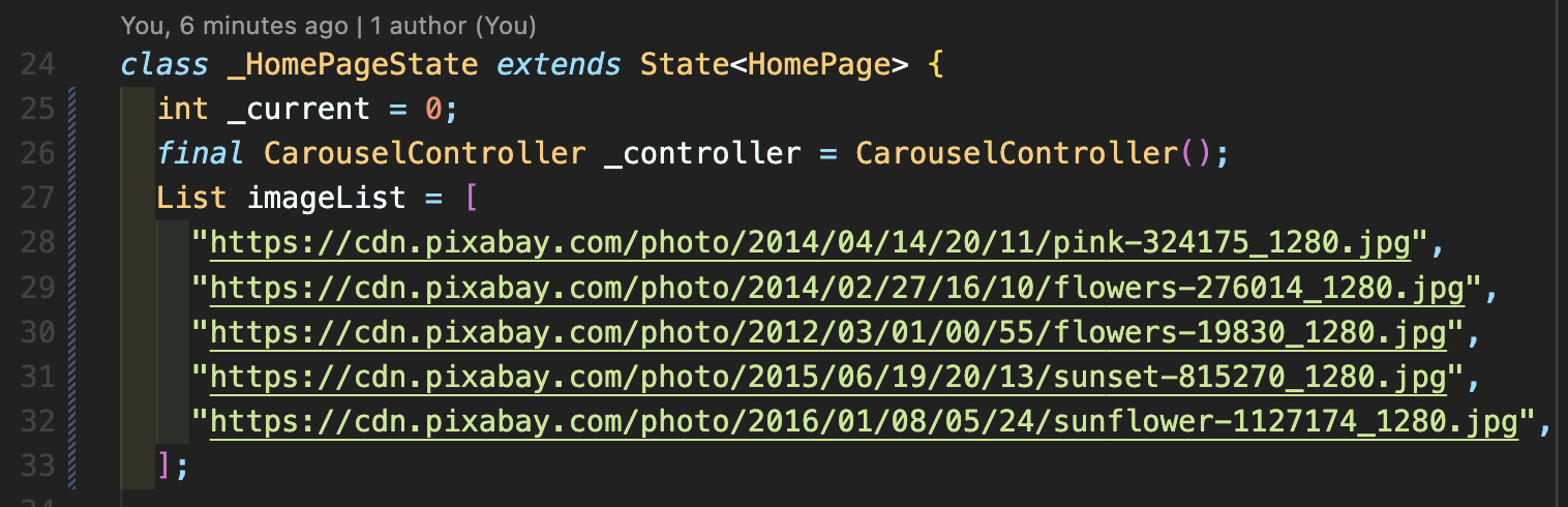 Step 2: 필요한 변수들을 선언해줍니다. _current는 현재 슬라이드 위치를 나타내는 인덱스값, _controller는 슬라이더를 조작할 수 있도록 해주는 컨트롤러, imageList에는 필요한 샘플 이미지들을 넣어줍니다.