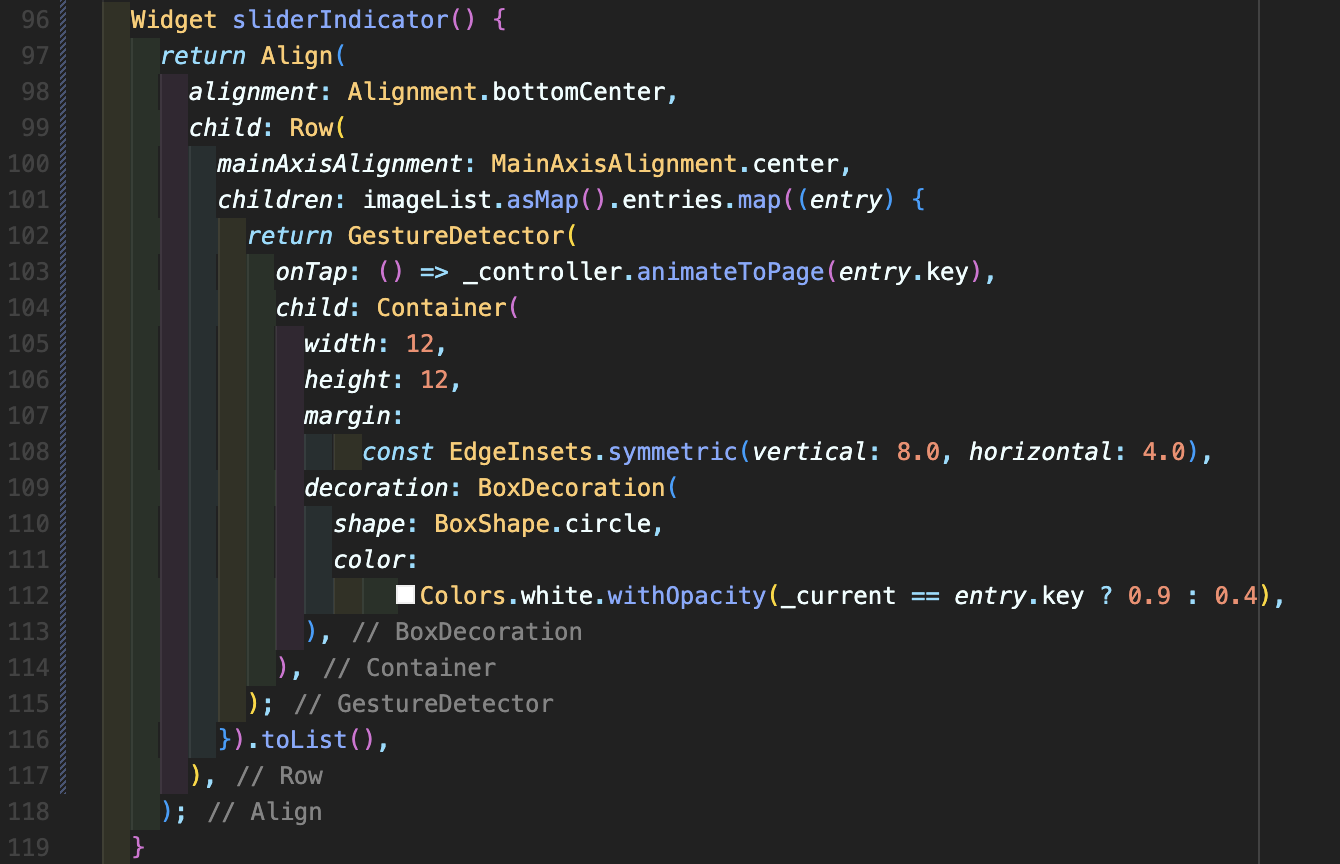 Step 4: 다음으로는 sliderIndicator에 관한 위젯을 작성해주고 여기에는 imageList.asMap().entries.map((entry) 형식으로 작성해주는데 그 이유는 현재 imageList 변수에는 이미지 리스트 밖에 없지만 각 key의 인덱스값 0~4를 받아오기 위한 방편이고 map으로 key, value 형식으로 만들어주기 위해서 사용합니다. 103번째의 _controller.animateToPage(entry.key)를 사용하여 각 슬라이드로 손쉽게 이동할 수 있도록 도와줍니다.