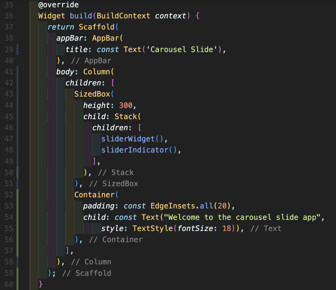 Step 5: build 위젯을 완성해줍니다. sliderWidget 위에 sliderIndicator를 띄워 놓기 위해서는 Stack(중첩 위젯)을 사용하시면 되며 Stack을 Container나 SizedBox로 높이를 지정해서 감싸주시면 됩니다. 그러면 위에 slideIndicator에 선언된 Align 위젯의 alignment: Alignment.bottomCenter 속성을 바로 사용해서 슬라이드 부분의 중앙 하단에 간단히 배치할 수 있습니다. 그 후에 현재 body: Column으로 감싸주고 있으므로 슬라이드 아래에 배치할 위젯들을 차례로 추가 배치하시면 됩니다.