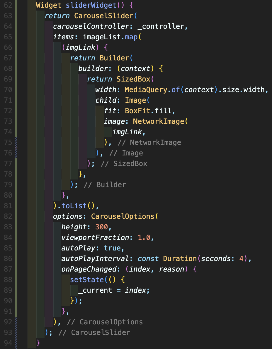 Step 3: sliderWidget을 별도로 선언해줍니다. 여기에서 imageList의 map를 활용해서 리스트에 있는 요소 숫자만큼 슬라이드를 반복적으로 만들어줍니다. 그리고 options 부분에는 슬라이드의 속성 값을 지정해줄 수 있는데 viewportFraction: 1.0을 넣으시면 여백 없이 채워진 이미지로 만들 수 있습니다. autoPlay: true를 넣으면 슬라이더 자동 재생 기능 활성화, autoPlayInterval는 자동 재생 시간을 몇 초 간격으로 지정할 것인지 여부, onPageChanged는 슬라이드의 페이지가 변할 때 어떤 기능을 담당할 것인지를 지정합니다.