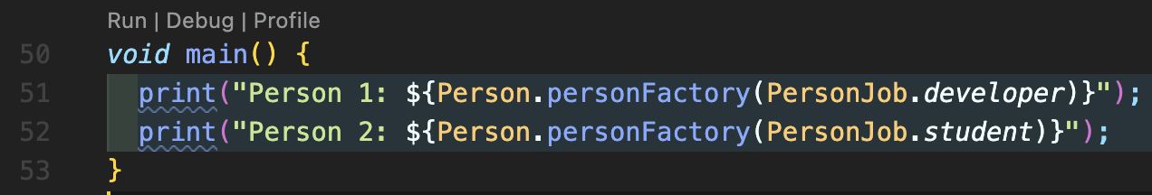 여기에서 주의하실 부분은 factory 다음에는 Person 클래스 이름이 바로 오며, 위처럼 생성자 형태로 하셔도 되고 Person.personFactory 메소드 형태로 구현하셔도 됩니다. 그러나 13번째, 15번째 줄에 아까 작성했을 때에는 메소드를 리턴했지만 여기에서는 반드시 Person 클래스를 implements하는 클래스로 return해야 합니다.