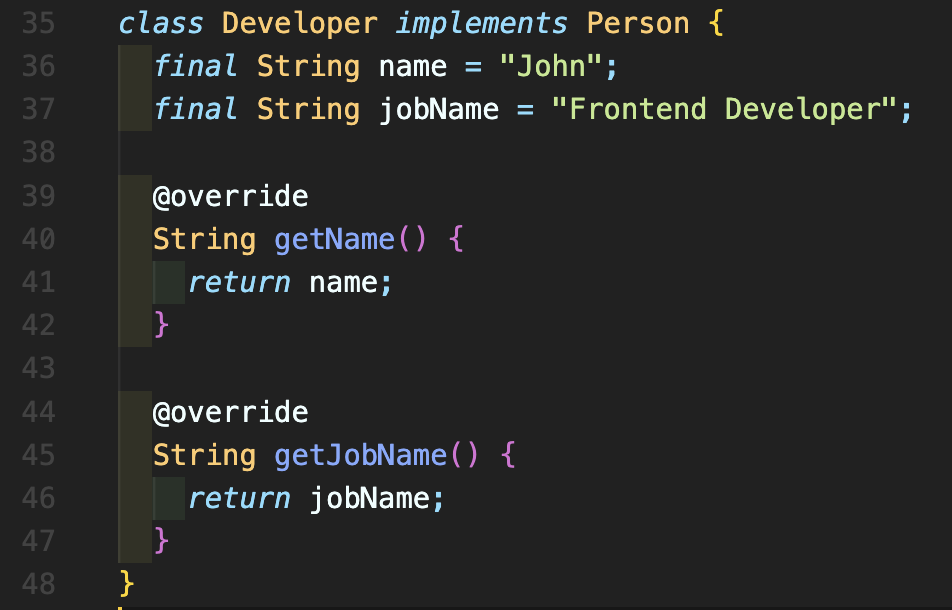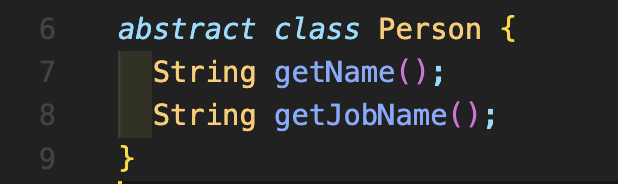 Step 2: abstract(추상) Person 클래스를 선언하고 getName과 getJobName을 각각 String 값을 return 해줄 수 있는 메소드를 선언하여 줍니다. 이 추상 클래스는 하위 클래스가 implements하게 되며 추상 클래스에서 선언된 메소드를 재정의(overrides)하게 됩니다. 추상 클래스에 선언된 메소드는 말그대로 메소드의 이름과 타입만 정의해주시는 것이며 실제로 구현되는 부분들은 자식(child) 클래스에서 재정의하게 됩니다.