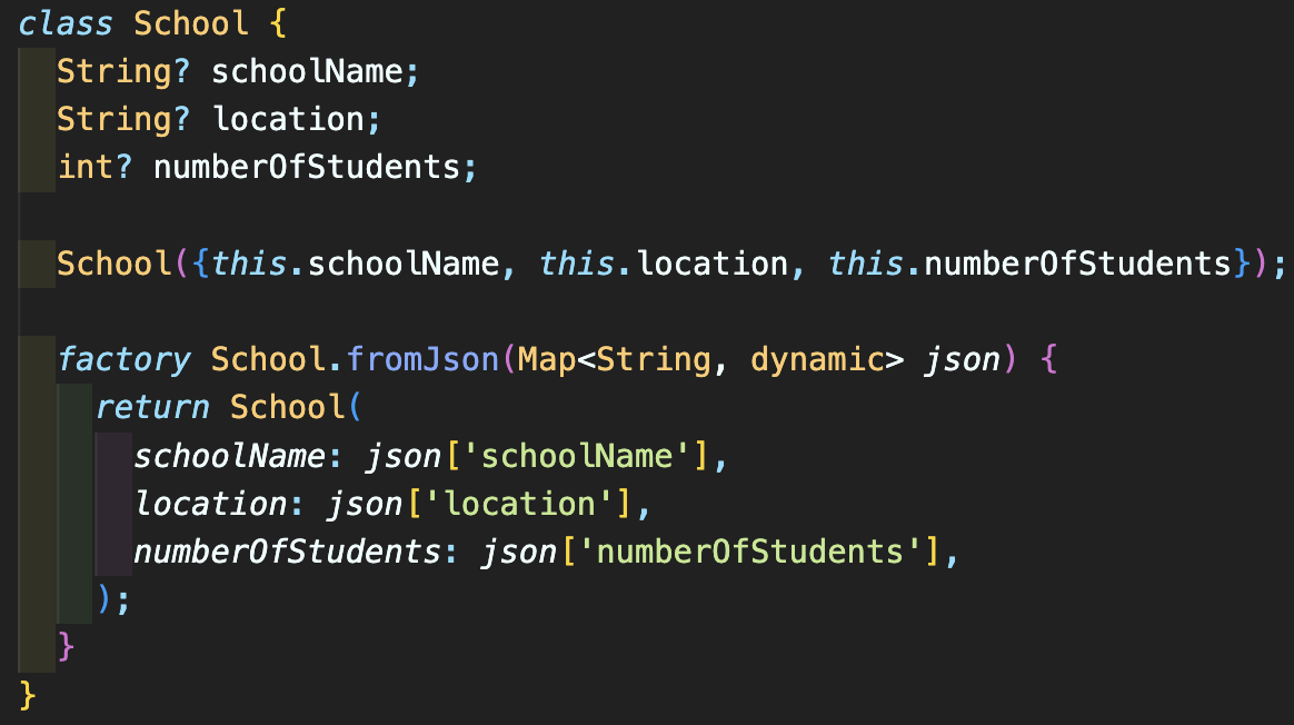 factory 키워드를 사용했기 때문에 return 타입으로는 반드시 클래스의 인스턴스가 return 되어야 하며 School 생성자로 선언하거나 위처럼 School.fromJson으로 구현할 수 있습니다. factory 개념에 따라 살펴보았는데 Singleton(싱글톤)이 무엇이며 왜 factory(팩토리)를 사용해야 하는지에 대해 조금이나마 이해가 되셨으리라 생각합니다. 감사합니다.