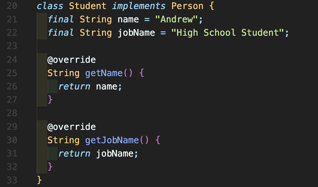 Step 3: Person를 implements하는 Student 클래스를 다음처럼 정의해줍니다.