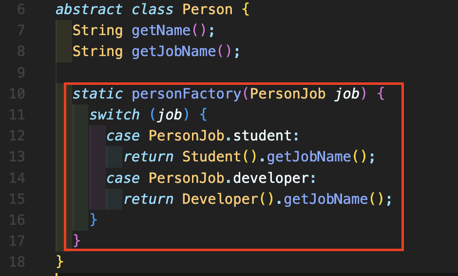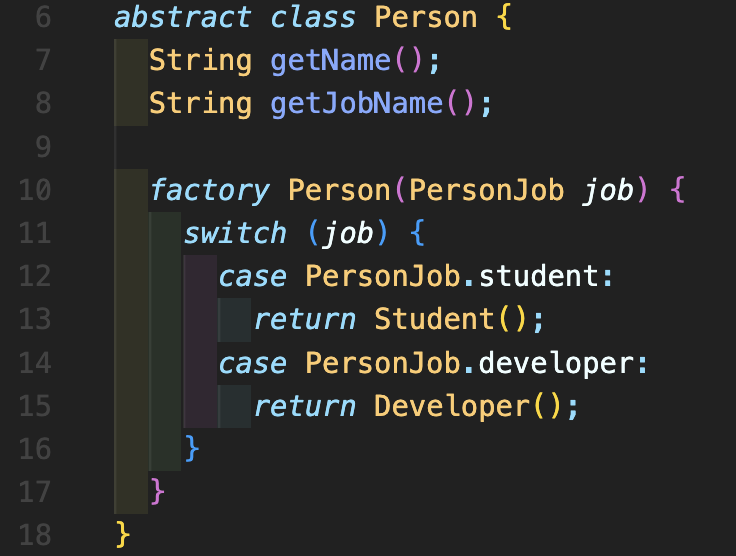 여기에서 주의하실 부분은 factory 다음에는 Person 클래스 이름이 바로 오며, 위처럼 생성자 형태로 하셔도 되고 Person.personFactory 메소드 형태로 구현하셔도 됩니다. 그러나 13번째, 15번째 줄에 아까 작성했을 때에는 메소드를 리턴했지만 여기에서는 반드시 Person 클래스를 implements하는 클래스로 return해야 합니다.