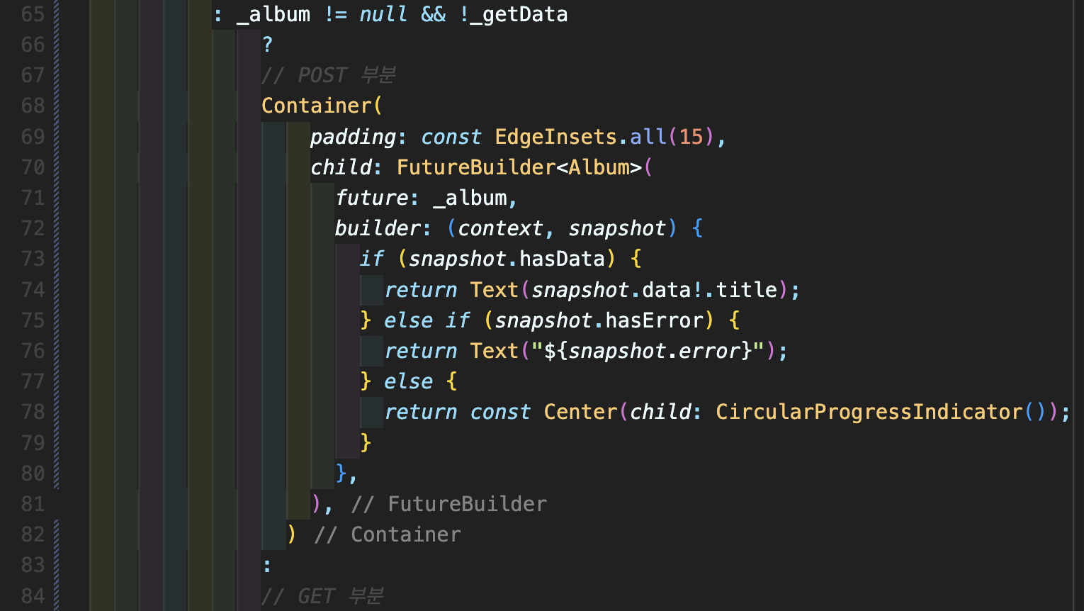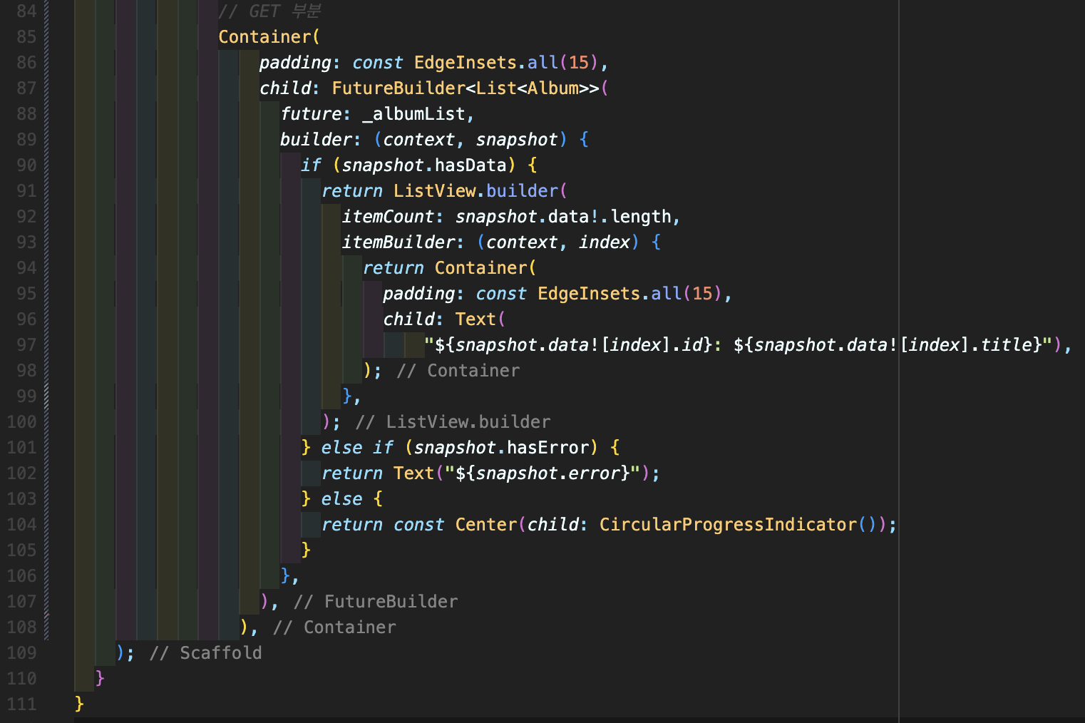 Step 9: 마지막 get 부분입니다. 여기에도 동일하게 FutureBuilder로 사용하지만 87번째 타입으로 FutureBuilder<List<Album>>으로 바꿔주어야 하며 그 안에 ListView.builder도 추가된 것을 확인해볼 수 있습니다.