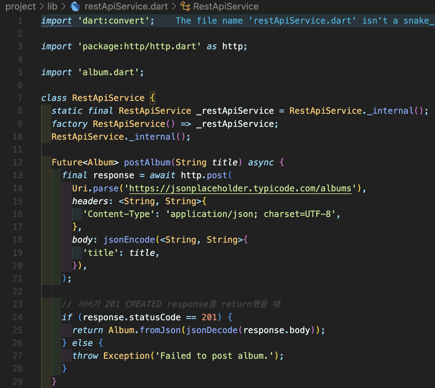 Step 4: RestApiService 클래스를 작성해줍니다. 여기에서 중요한 부분은 13번째 줄로 http.post를 사용하여 데이터를 생성하는 과정을 거칩니다. 그 후 24번째 줄을 통해 statusCode가 201일 때(created response) 해당 내용을 return할 수 있도록 합니다.
