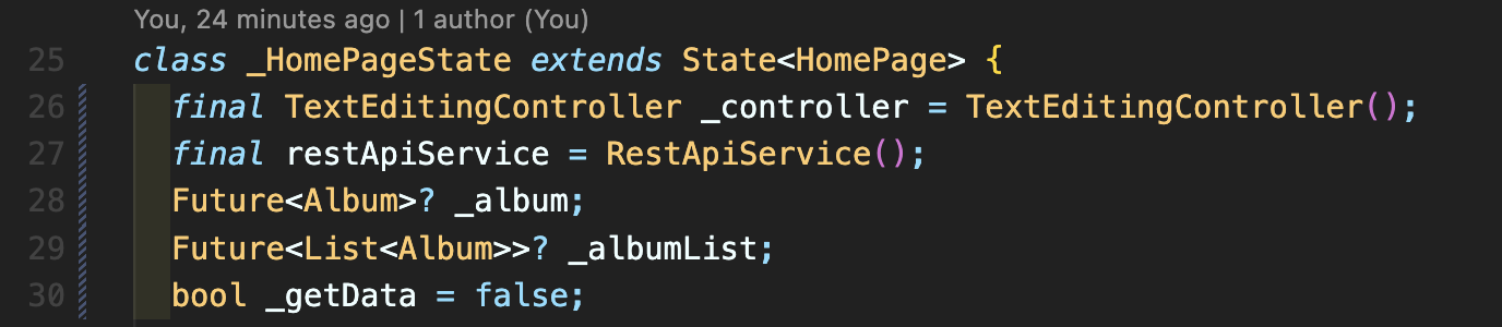 Step 6: main.dart의 _HomePageState 부분에 다음처럼 변수들을 선언해줍니다. 27번째의 RestApiService()는 싱글톤(Singleton)으로 단 하나의 인스턴스만 생성해서 관리합니다.