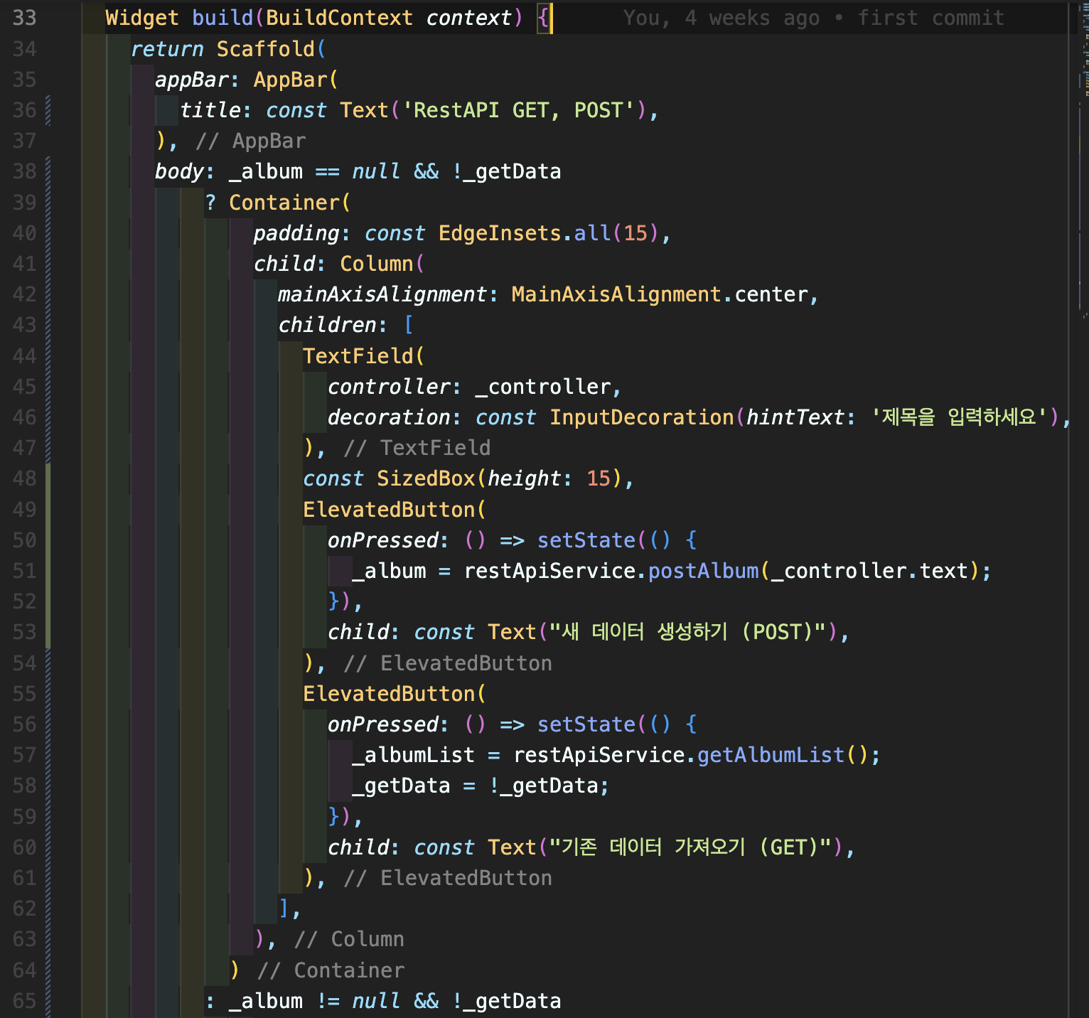 Step 7: 새 데이터를 입력 받을 수 있는 위젯을 만들어줍니다. 39~64번째 줄 (전체 소스 코드는 아래에 첨부하였으니 참고하시기 바랍니다) 여기에서 중요한 부분은 51번째 라인으로 _album = restApiService.postAlbum(_controller.text) 부분입니다. 그리고 55~61번째 라인을 통해서 기존 데이터 가져오기 버튼을 누르면 57-58번째 줄을 통해 데이터를 가져올 수 있도록 하였습니다.