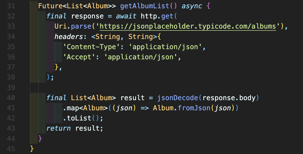 Step 5: 이어서 데이터를 가져오기 위한 get 부분도 작성합니다. 이 부분은 이전 포스팅에서도 자주 했었던 부분이기에 익숙하실 것으로 생각되며 http.get과 headers를 통해 데이터를 어렵지 않게 가져올 수 있습니다. 40-42번째 부분을 통해 List 형태로 만들어 return 할 수 있습니다.