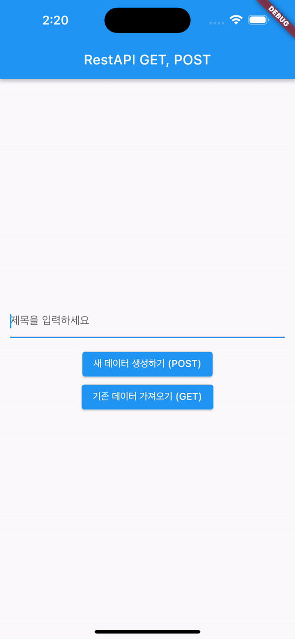 Step 7: 새 데이터를 입력 받을 수 있는 위젯을 만들어줍니다. 39~64번째 줄 (전체 소스 코드는 아래에 첨부하였으니 참고하시기 바랍니다) 여기에서 중요한 부분은 51번째 라인으로 _album = restApiService.postAlbum(_controller.text) 부분입니다. 그리고 55~61번째 라인을 통해서 기존 데이터 가져오기 버튼을 누르면 57-58번째 줄을 통해 데이터를 가져올 수 있도록 하였습니다.