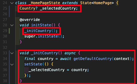 Step 3: 다음을 추가해줍니다. 이 Country 클래스에는 name, flag, countryCode, callingCode가 들어가 있습니다. 그리고 국가 리스트들을 초기화하고 기본 국가를 가지고 오기 위한 작업을 진행합니다.