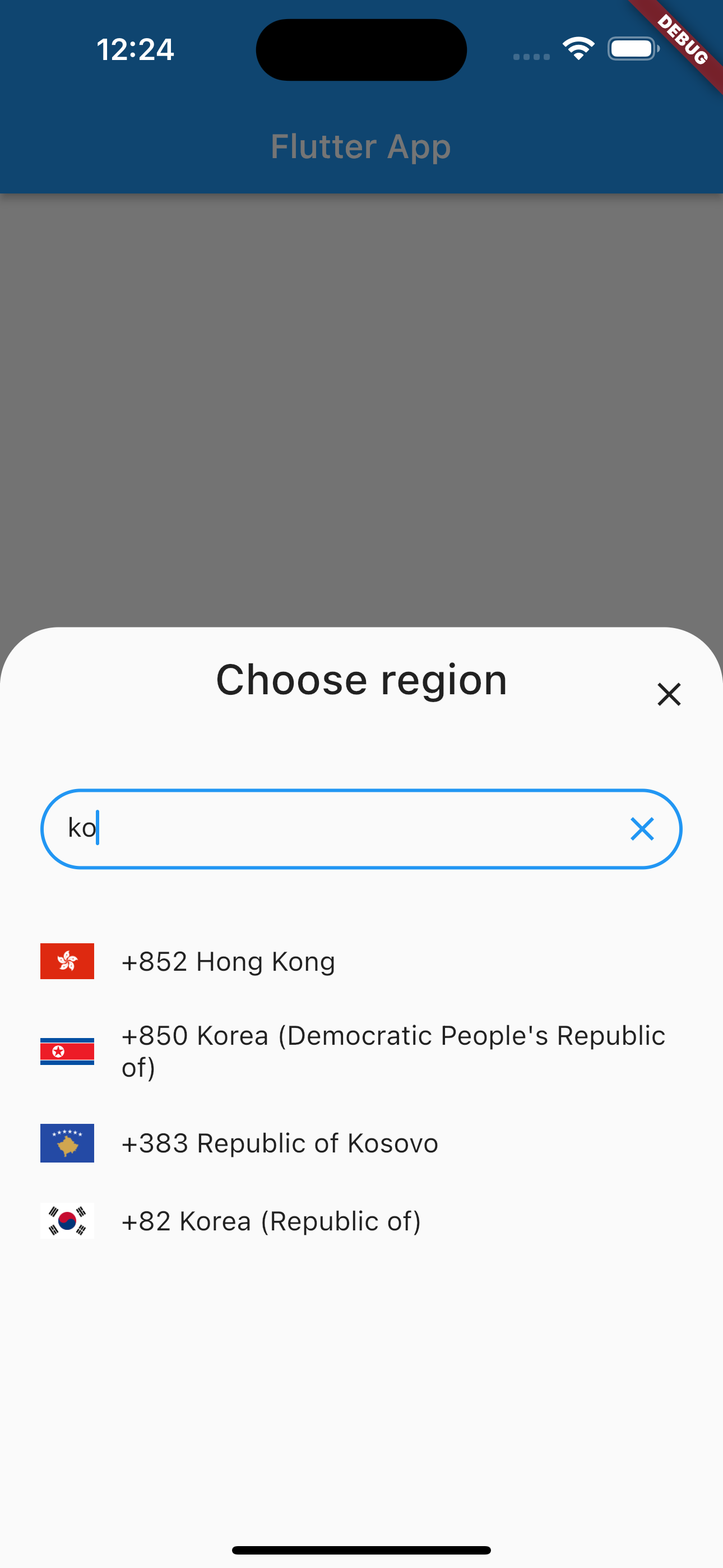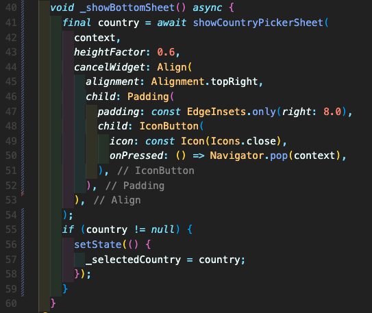 Step 4: 아래쪽에서 국가를 고를 수 있는 UI부분을 만들어주며 heightFactor는 기기 대비 높이 비율을 말하며 cancelWidget은 선택하지 않고 그냥 닫고자 할 때 위젯, 55-59번째 줄에서는 나라가 선택되었다면 _selectedCountry에 업데이트해줍니다.
