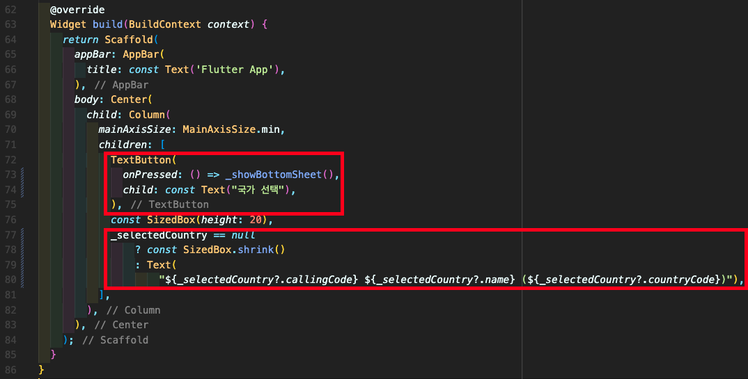Step 5: 나머지 부분을 다음처럼 구성해주면 됩니다. 72-75번째 줄은 버튼, 77-80번째 줄에는 나라 선택을 마무리하고 나서 어떤 국가, 국가 코드, 국가 전화 번호 등의 정보를 나타내도록 만들어줍니다.
