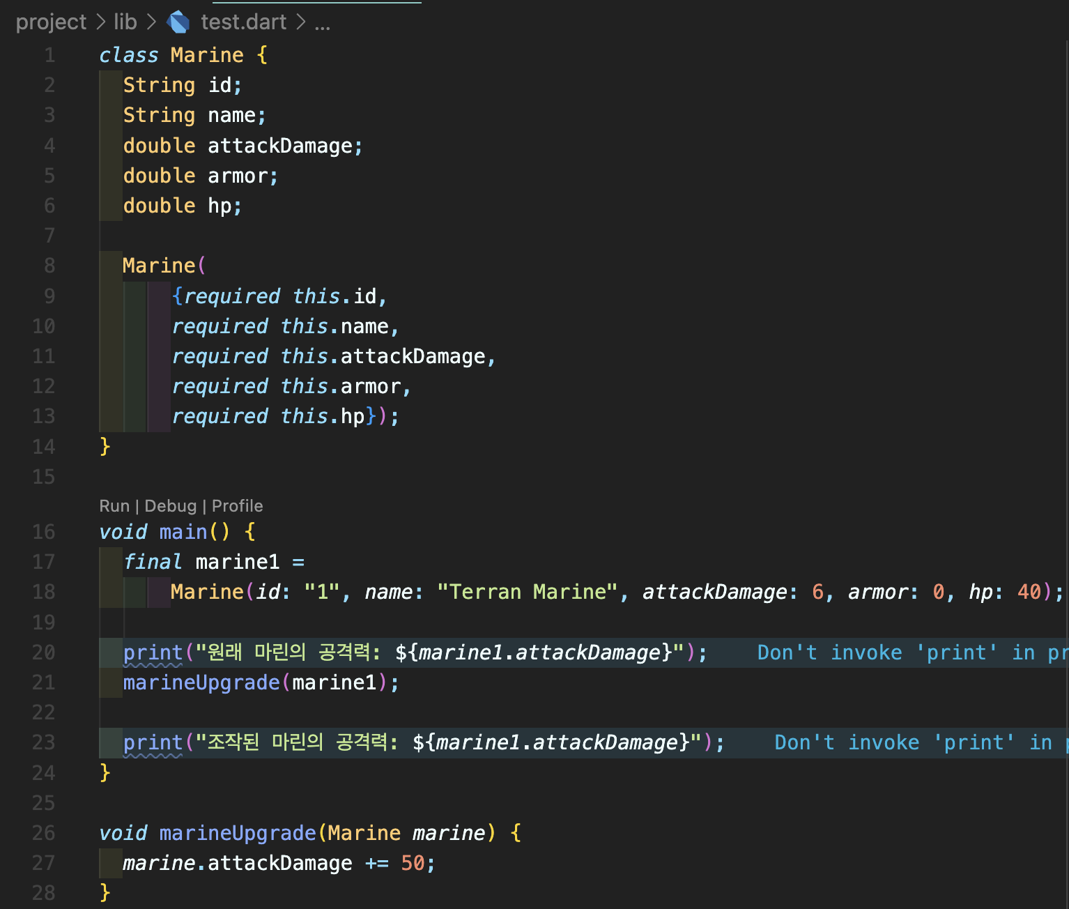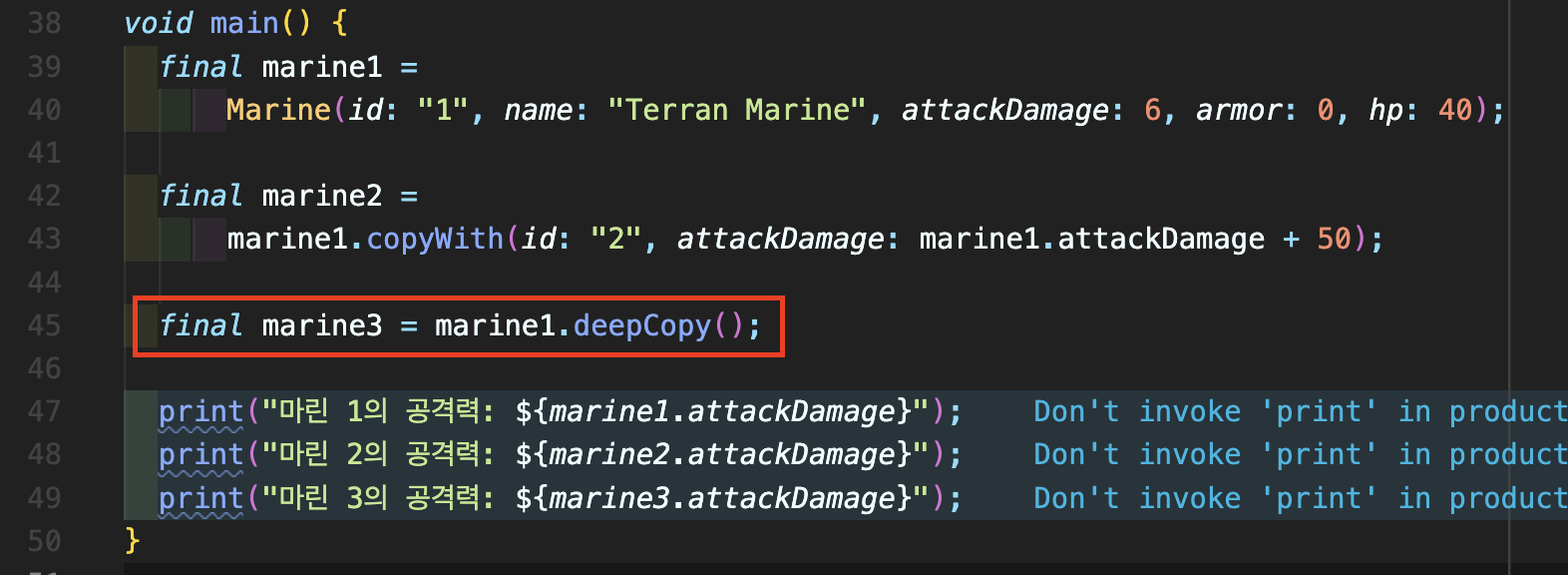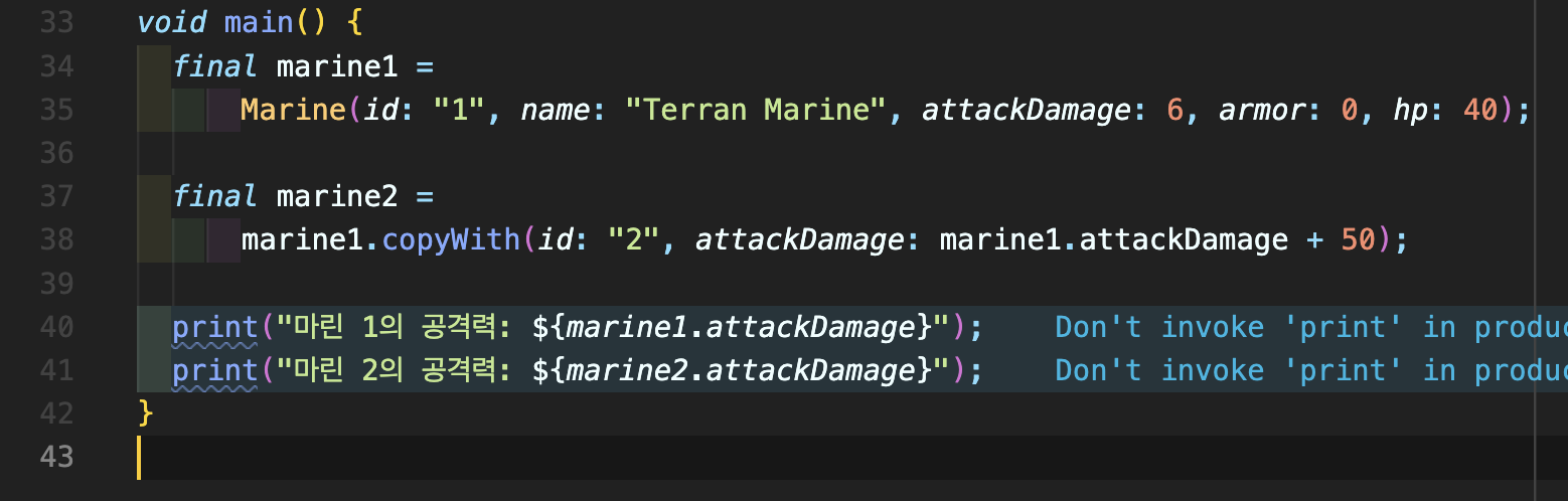 그 후에 marine1.copyWith로 새롭게 id와 attackDamage를 정의해주면 됩니다.