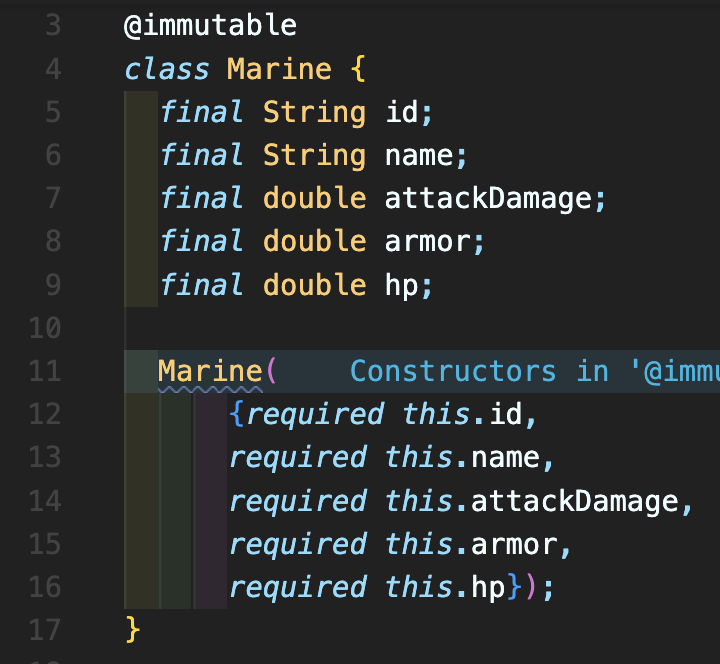 위에 보시면 marine1.deepCopy() 호출하여 marine3의 인스턴스를 생성할 수 있습니다. 물론 이런 용도로도 쓰일 수 있지만 다른 함수의 파라미터로 전달할 때 이 복사한 것을 파라미터로 전달할 때에도 이렇게 사용될 수 있습니다. 복사해서 전달하게 되면 다른 클래스에 의해 영향을 받지 않고 자신이 속한 클래스 내에서는 신뢰할 수 있는 데이터를 가지는 유효한 값을 지니게 됩니다. 이 immutable 객체를 이해해야 하는 이유는 그 다음 포스팅에서 살펴볼 freezed에 대해 사전 이해가 필요하기 때문이고 이 개념을 실제로 사용하지는 않는다 하더라도 이 부분에 대한 이해가 있다면 실제 개발하는 데에 도움을 줄 수 있으리라 생각합니다.