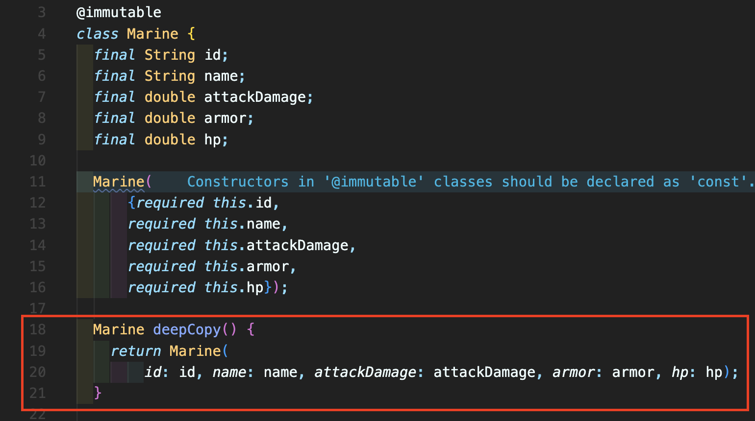 테스트한 결과입니다. 이렇게 객체를 복사해서 하나를 더 만들어주는 것이 좋습니다. 이렇게 한다면 기존의 marine1의 데이터는 조작될 수 없는 데이터로 신뢰할 수 있게 되고 marine1을 직접적으로 건드리는 코드는 컴파일 과정에서 오류를 잡아낼 수 있기 때문에 유용하게 사용될 수 있습니다. copyWIth 이외에 직접 마린 객체를 모든 인스턴스 변수들을 포함하여 깊게 복사(deep copy)해야 하는 경우가 많을텐데 이 경우를 위해 deepCopy 메소드도 작성해주도록 하겠습니다.