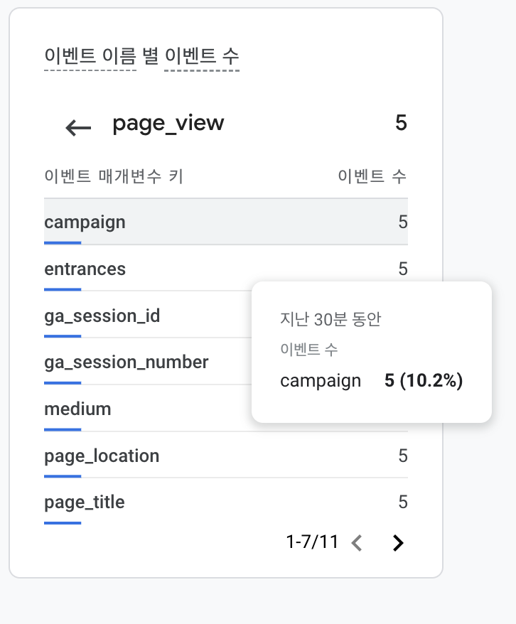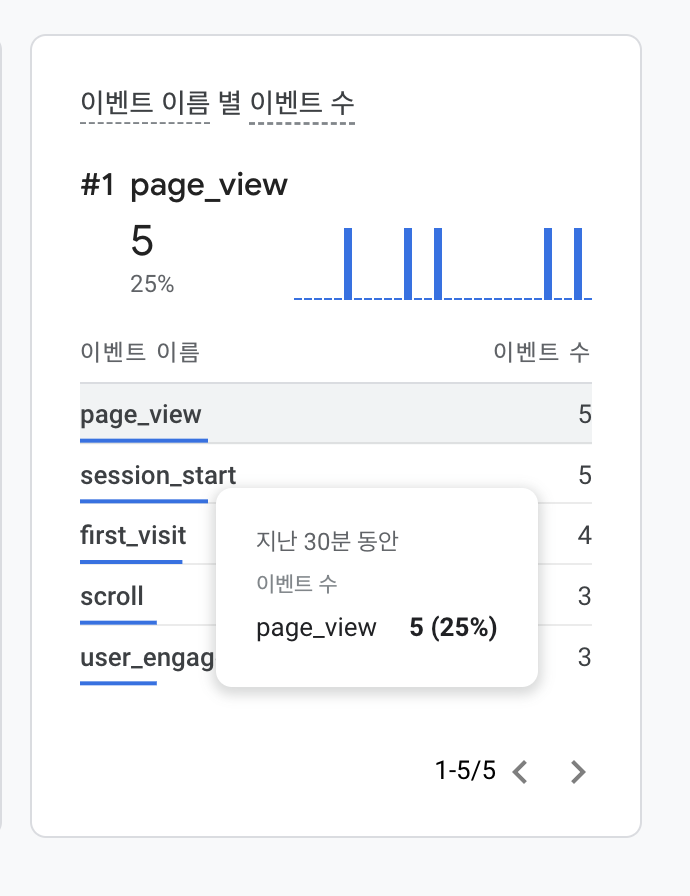 Step 3: 실제로 웹에서 이 url 접속해본 뒤에 애널리틱스4의 실시간에서 확인해봅니다. 아래처럼 page_view를 클릭해봅니다.
