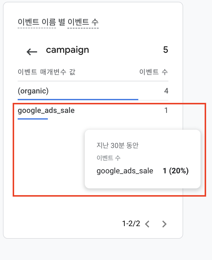 Step 5: 이렇게 UTM 링크에서 선언한 google_ads_sale이 확인되는 것을 확인해볼 수 있습니다. 현재 다른 데이터도 있기 때문에 빨간색 박스로 하이라이트 처리했습니다.
