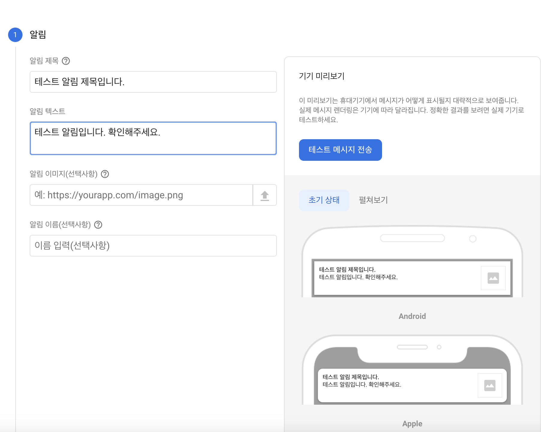 Step 8: 적절하게 내용 입력 후 테스트 메시지 전송을 눌러봅니다.