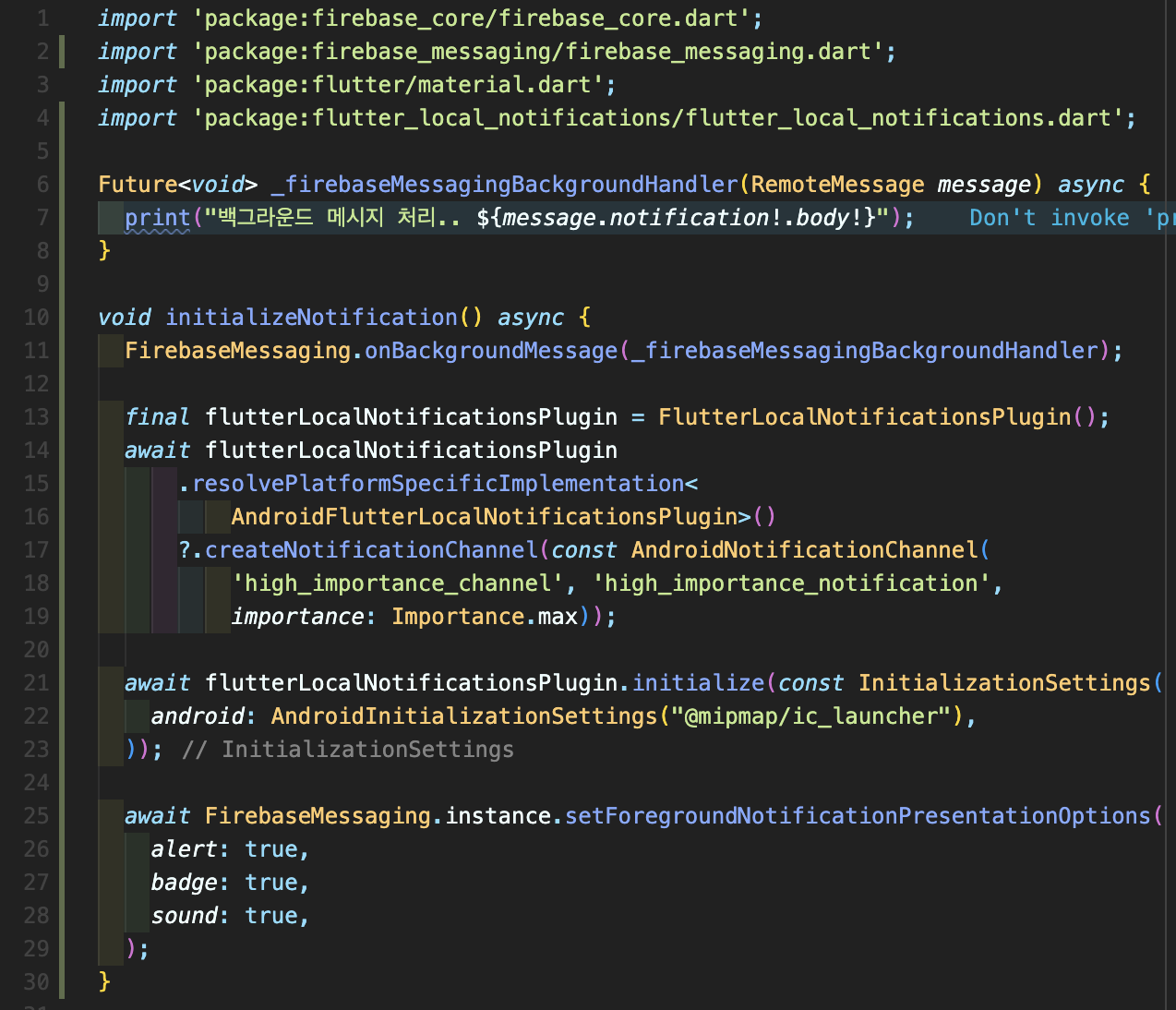 그 다음 10~30번째 줄은 기본적인 notification의 설정을 해주기 위함입니다. ios도 여기에서 합니다.