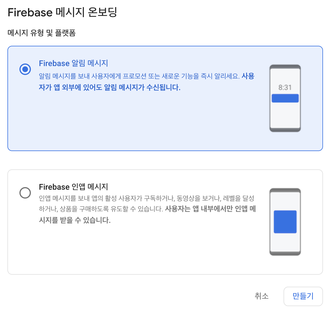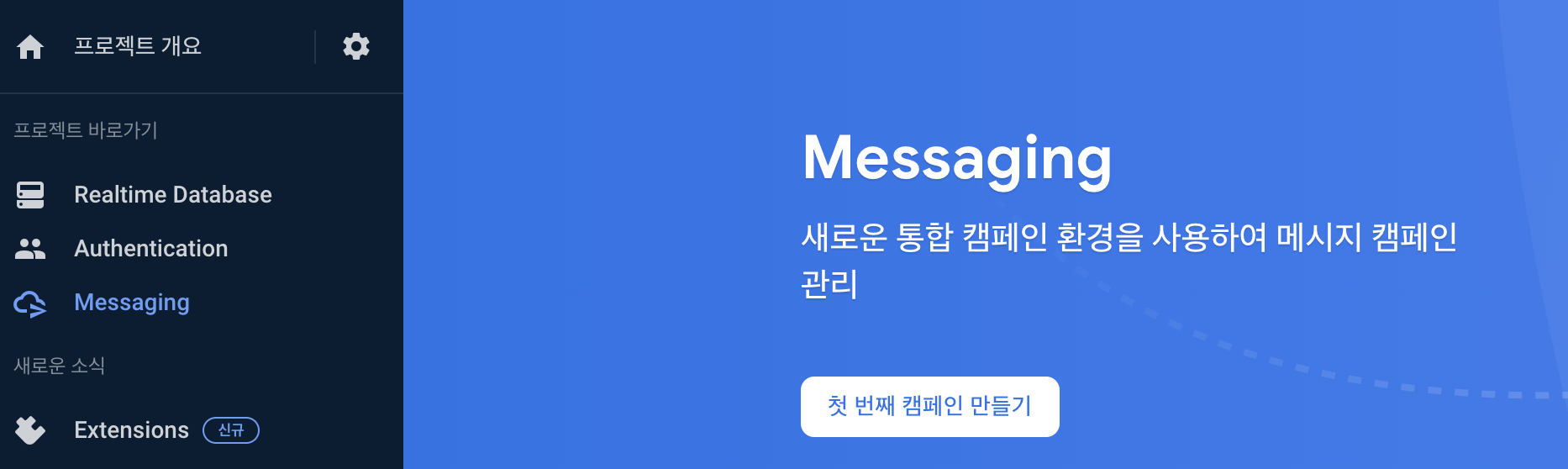 Step 6: 파이어베이스 콘솔에 들어가셔서 Messaging 메뉴(보이지 않으시면 좌측 하단의 "모든 제품" 클릭하시면 볼 수 있습니다. 그리고 첫 번째 캠페인 만들기를 눌러줍니다.
