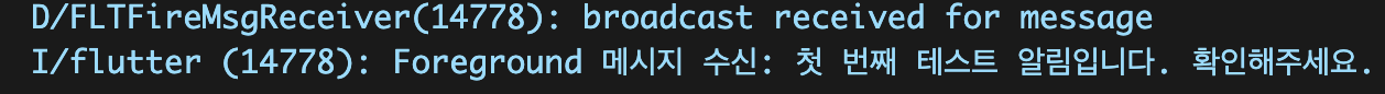 앱이 열려 있는 Foreground 상태인 경우 아래처럼 메시지가 뜹니다.