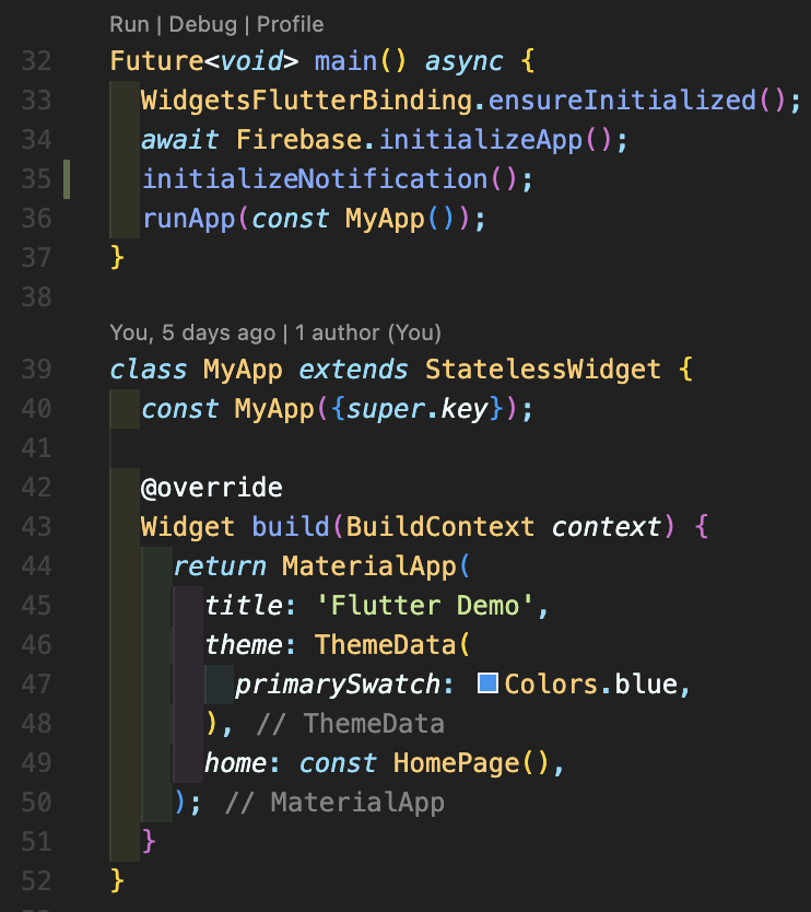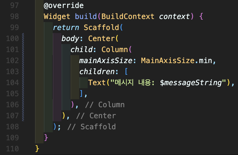 Step 5: main.dart에 아래처럼 작성해줍니다. 전체 코드는 맨 아래에 첨부했으니 참고하시기 바랍니다.