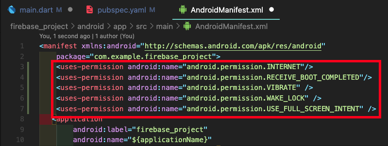 Step 2: 먼저 안드로이드의 설정을 위해 android > app > src > main > AndroidManifest.xml에서 다음 5줄을 추가해줍니다.