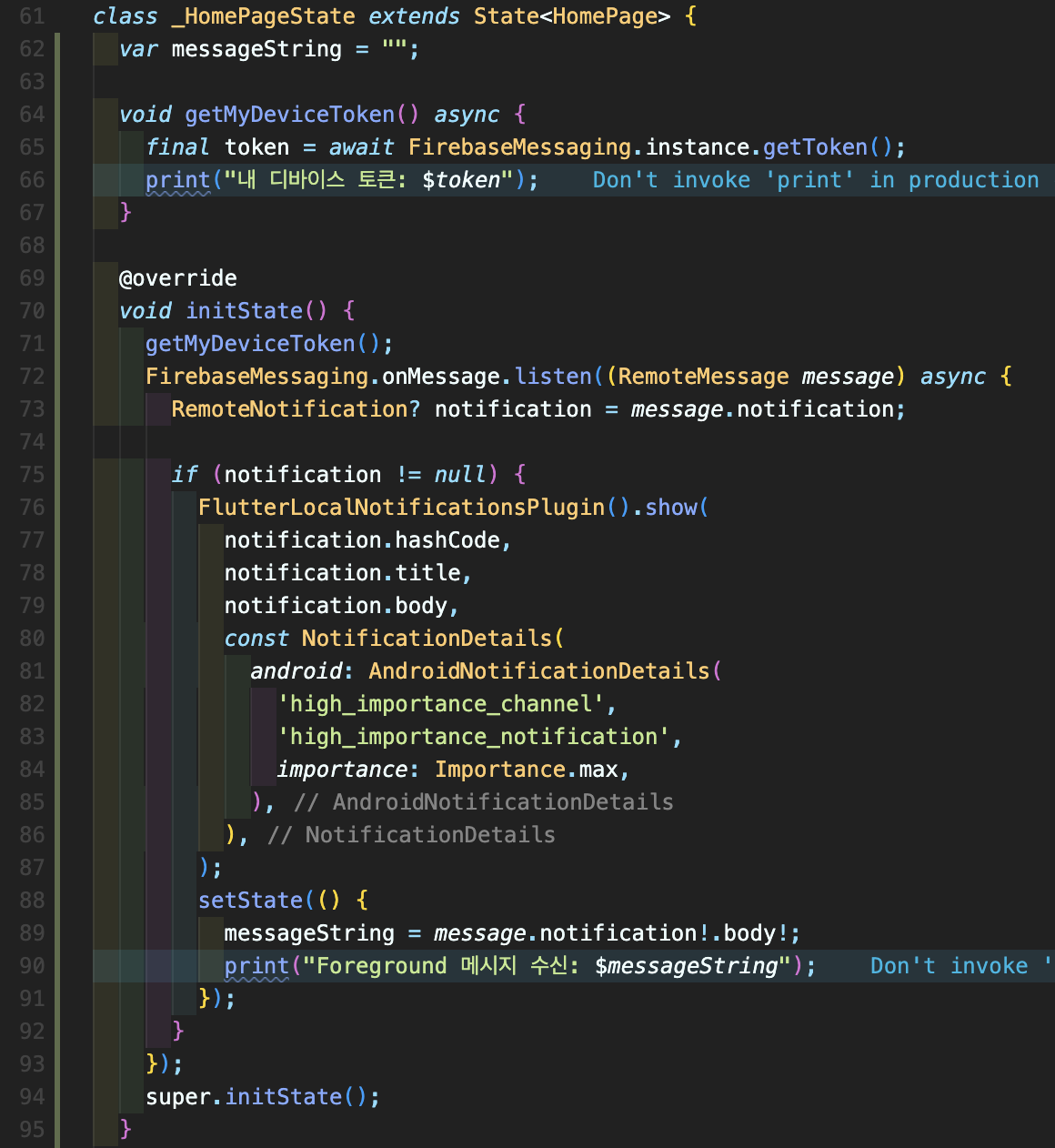 그 후에 64-67번째 줄에 보시면 디바이스 토큰을 가져오는 부분이 있습니다. 이 디바이스 토큰을 알아야 해당 디바이스로 제대로 알림을 푸시해줄 수 있기 때문에 반드시 토큰 값을 알아야 합니다. 추후 이것을 파이어베이스에 등록해야 합니다. 72번째에 onMessage 메소드는 앱이 현재 열려 있을 때 (foreground) 푸시 메시지를 확인합니다.