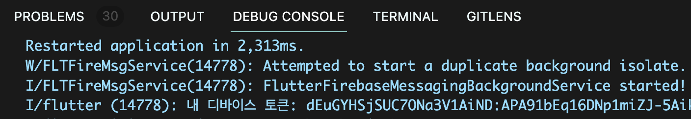 Step 9: 토큰을 추가해야 하는데 토큰 추가를 위해 먼저 정확한 테스트를 위해 실제 기기(안드로이드는 에뮬레이터도 되긴 합니다)를 연결하여 디버깅 모드(F5 혹은 flutter run --debug lib/main.dart 커맨드 입력)로 실행해줍니다.