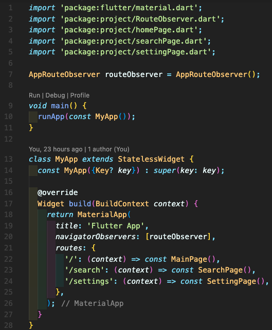 Step 4: main.dart를 작성합니다. AppRouteObserver의 인스턴스를 만들어주시고 (7번째 줄), 그 다음 22-24번째 줄에 routes 객체를 명시해줍니다.