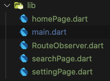 Step 1: 시작하기에 앞서 구현 방법은 여러 가지로 꼭 해당 방법으로 구현하실 필요는 없으시고 라우팅 방법도 필자처럼 하실 수도 있고 Navigator.push, pop 등을 활용해서 하실 수도 있는 등 구현 상황에 따라 다르게 적용하셔야 함을 미리 말씀을 드립니다. 먼저 아래처럼 5개의 파일들을 구성합니다.