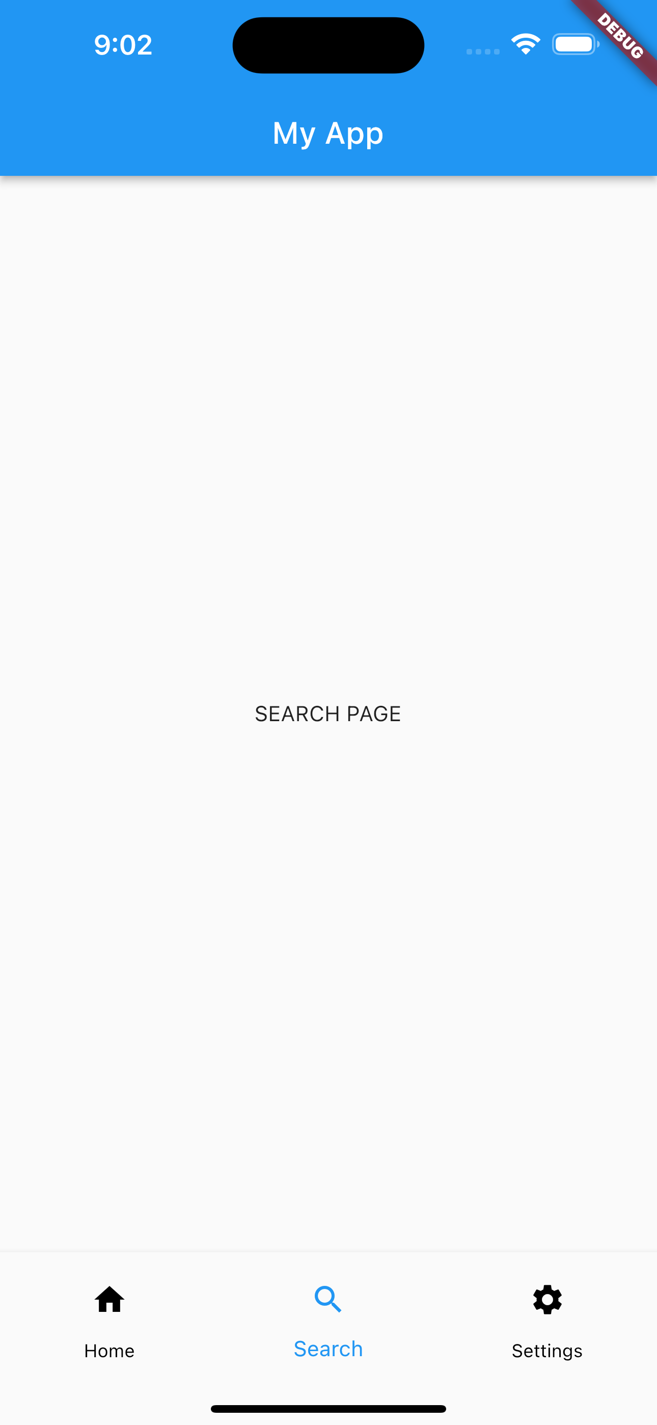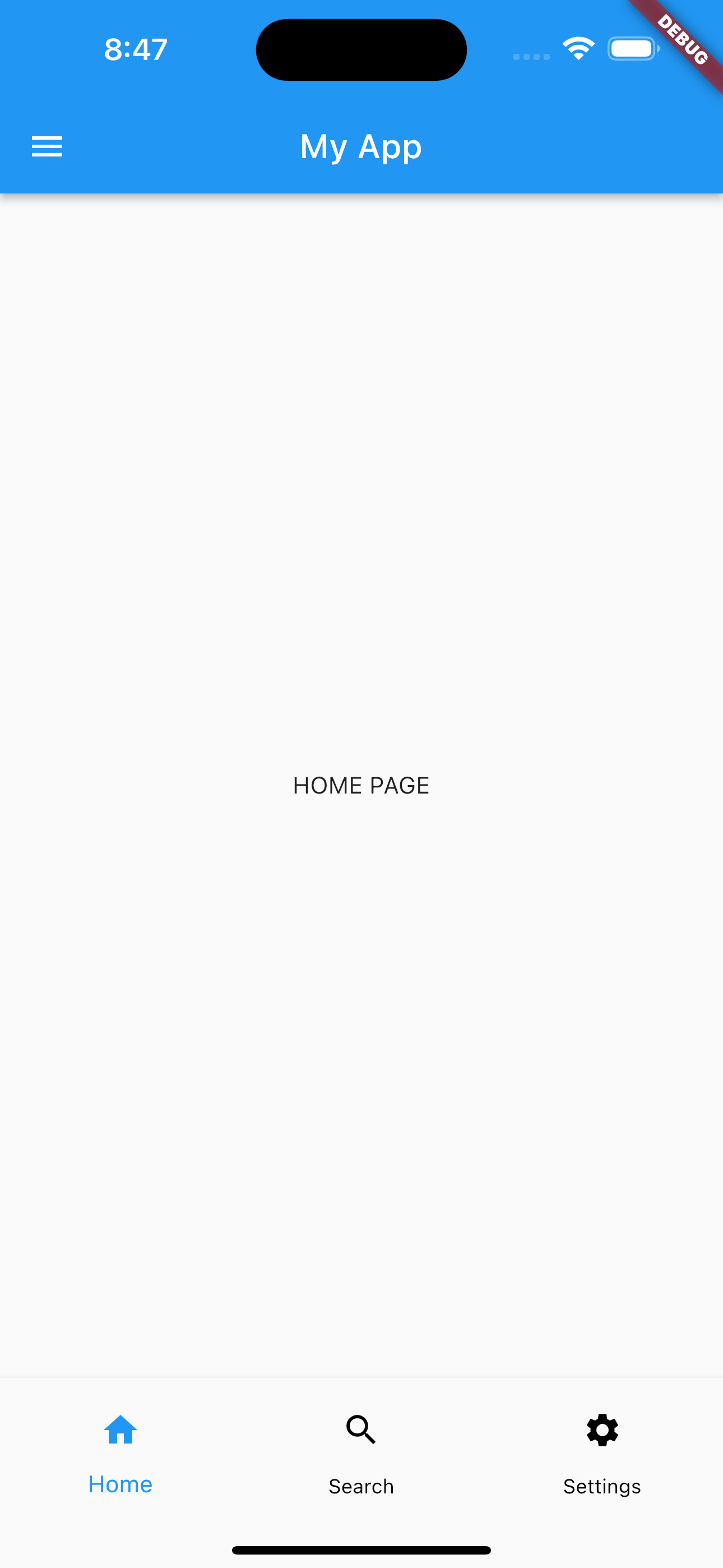 아래처럼 Home, Search, Settings 페이지를 구성하고 Home이 아닌 Search와 Settings에서는 좌측 상단의 drawer 메뉴를 보이지 않게 하고 하단 메뉴의 아이콘을 클릭하면 각 페이지로 이동할 수 있는 간단한 실습을 해보도록 하겠습니다.
